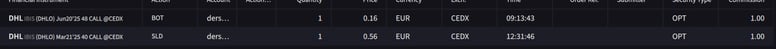 Aus diesem Grund bereiten wir uns auf den Ausstieg aus der DHL vor. Wir haben mehrere covered calls mit unterschiedlichen Laufzeiten und Strikepreisen laufen und einer der calls wurde heute im Gewinn mit +67 % zurückgekauft.