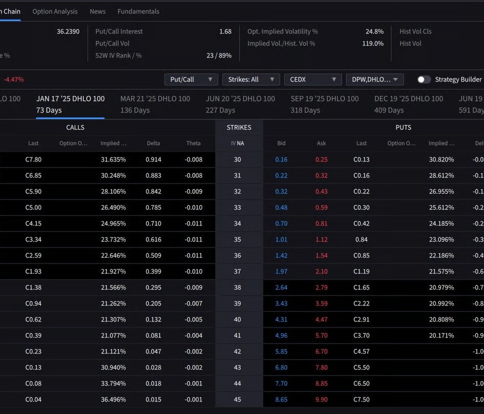 Ich glaube, dass die DHL auf langfristiger Basis weit über 40 € notieren wird (Analysten Konsens ca. 49 €) aber wir sind Optionstrader und können wenig liquide Aktien praktisch nicht handeln.
