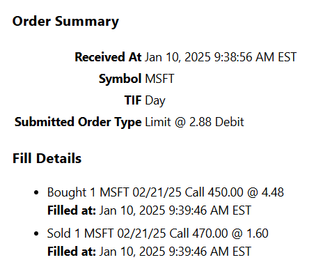 Wir haben einen 450/470 Call Debit Spread mit 42 Tagen Laufzeit für 288 $ gekauft, der spekulativ ist.