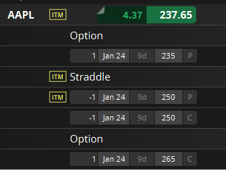 Der Iron Butterfly ging nicht durch und so mussten wir erst einen Straddle aufsetzen und die Wings einzeln nachkaufen. Wir haben ca 1.100 $ Prämie eingenommen und riskieren max. 400 $. Der Trade ist für 9 Tage aufgesetzt worden, da APPL demnächst Zahlen hat und da wollen wir nicht reinfallen.