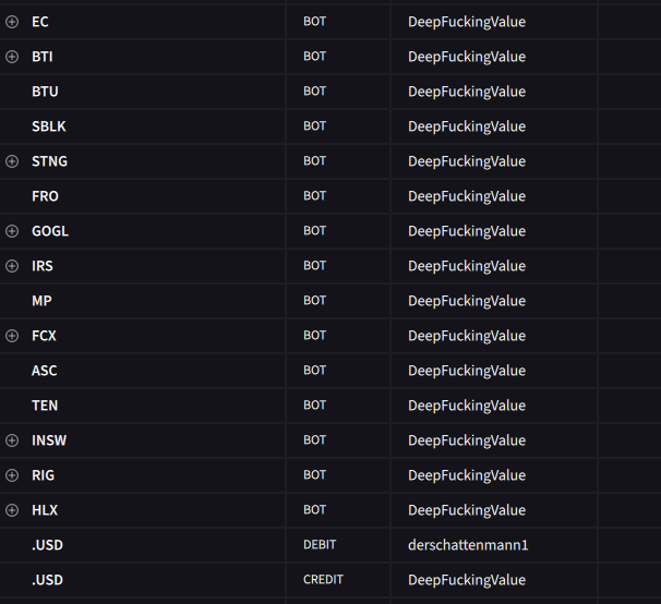 Wir positionieren uns gerade in unserem Value Portfolio neu: Die Sektoren die wir kaufen, sind im Wesentlichen Alles was Grüne hassen: Shipping, Offhsore Oil & Gas, Kohle, Rauchen, Immobilien Südamerika, Kupfer, Uran, Energie.
