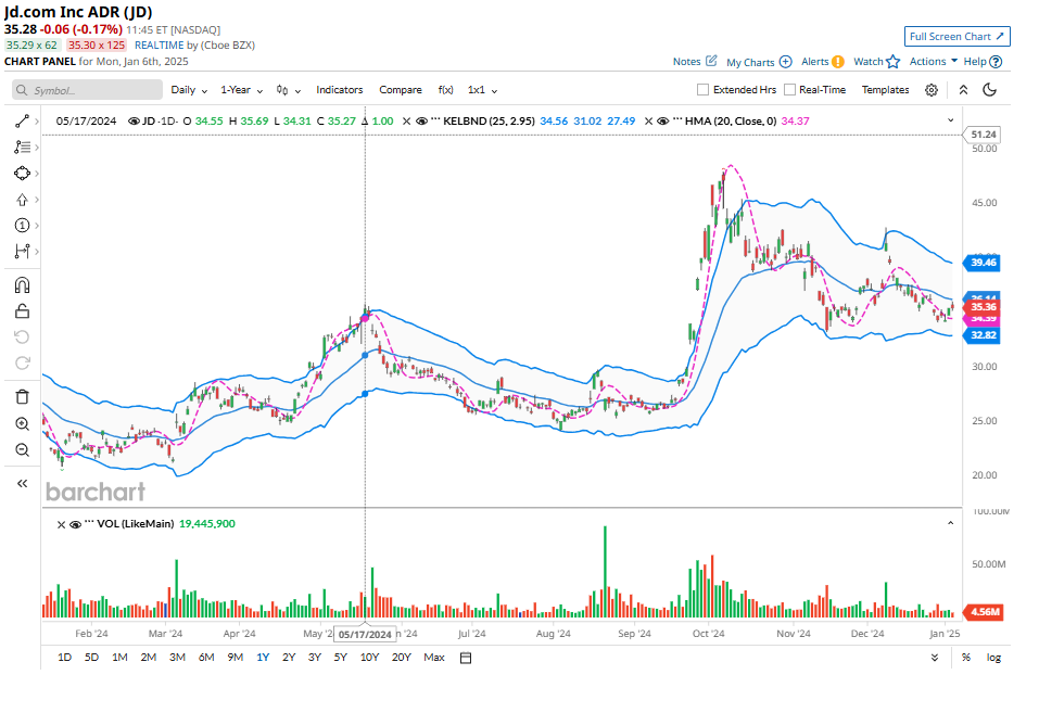 Im letzten Quartal 2024 haben wir JD mehrmals gehandelt und unsere Positionen über Covered Calls im Gewinn abgegeben. Wir haben heute eine 2/3 Stage 1 Position @ 35,57 gekauft und haben zusätzlich Puts @ 33 liegen. Wir mögen JD und würden im Falle eines Rücksetzers weitere Puts verkaufen.