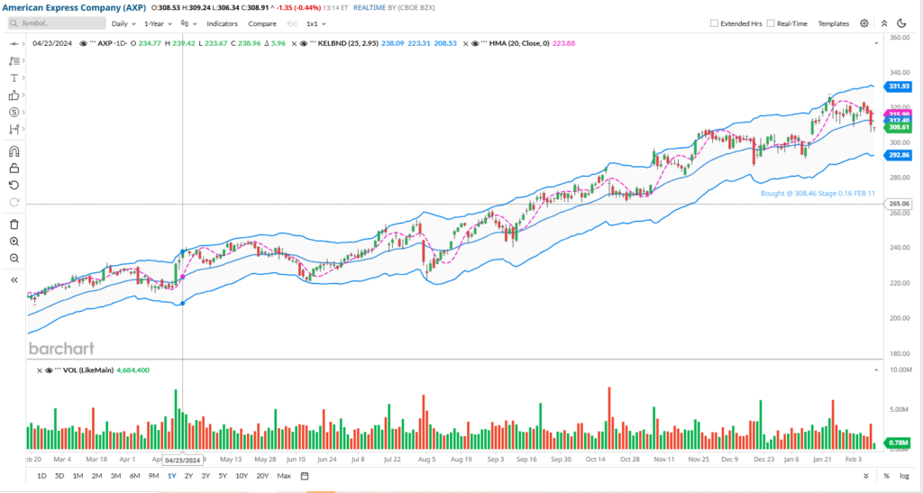 Wir haben eine neue SW5 Position mit AXP eröffnet und sind bei dieser Aktie klein eingestiegen. Unser Einstieg liegt bei $ 308,46 und unser TP bei 325.