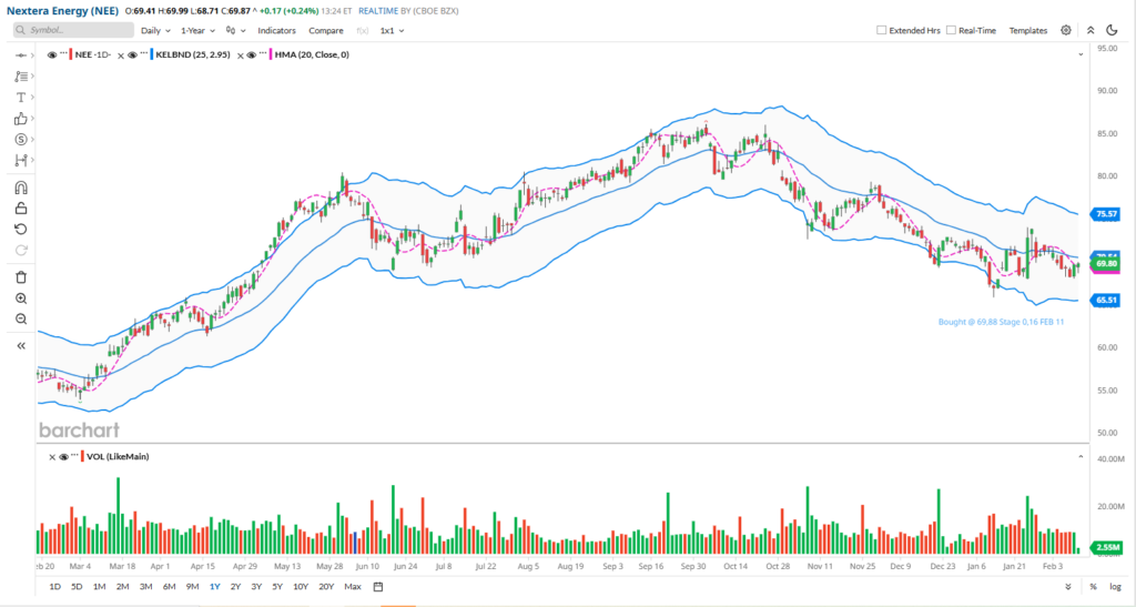 Auch NEE haben mit einer kleinen Position gekauft. Hier handelt es sich auch um einen SW5 Trade und unser Einstiegspreis beträgt $ 69,88. Wir haben unsere TPs bei 73,69 und 77,32 platziert.